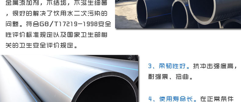 PE管材綜合性能道應(yīng)用領(lǐng)域|耐溫性|低溫脆化溫度很低,可在-40℃到60℃范圍內(nèi)使用,冬季安裝施工不會(huì)發(fā)生管道脆裂?。